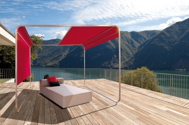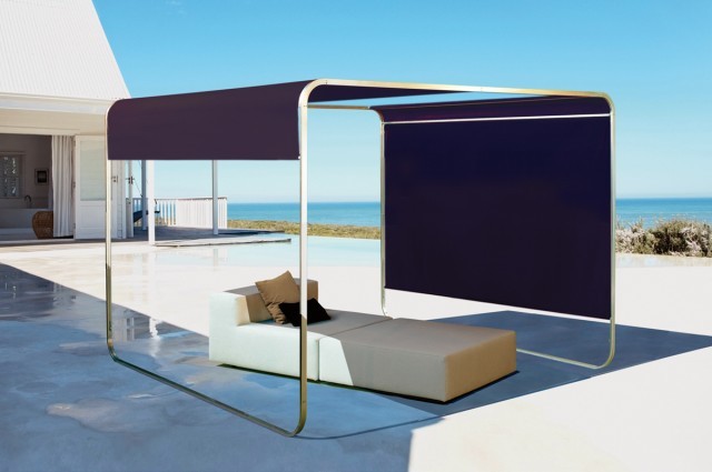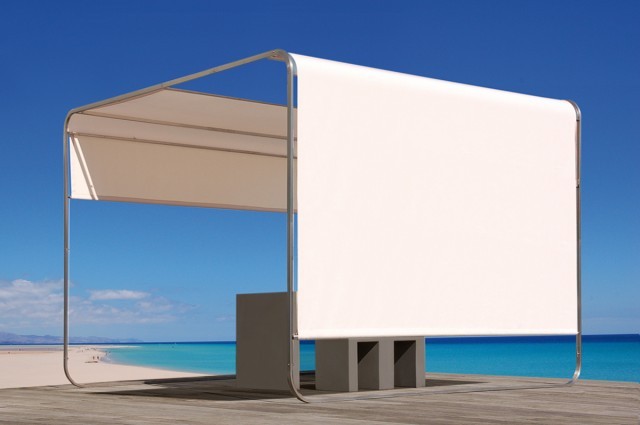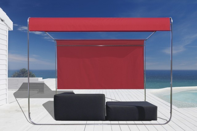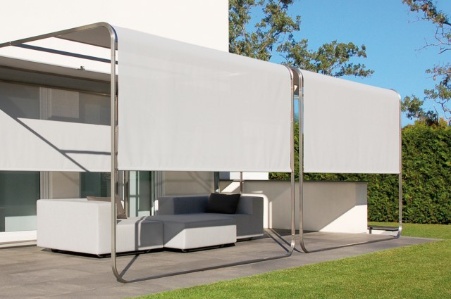 Endlich kann man seine Privatsphäre auf ästhetisch höchst anspruchsvoller Weise eingrenzen. Beim Sonnenbad oder in gemütlicher Runde können ungewünschte Blicke vermieden werden. Die Stoffbahnen des Sonnensegels ShangriLa können innerhalb des Gestells bewegt werden. In der Wandposition dienen sie als Sichtschutz oder auch als Windschutz.